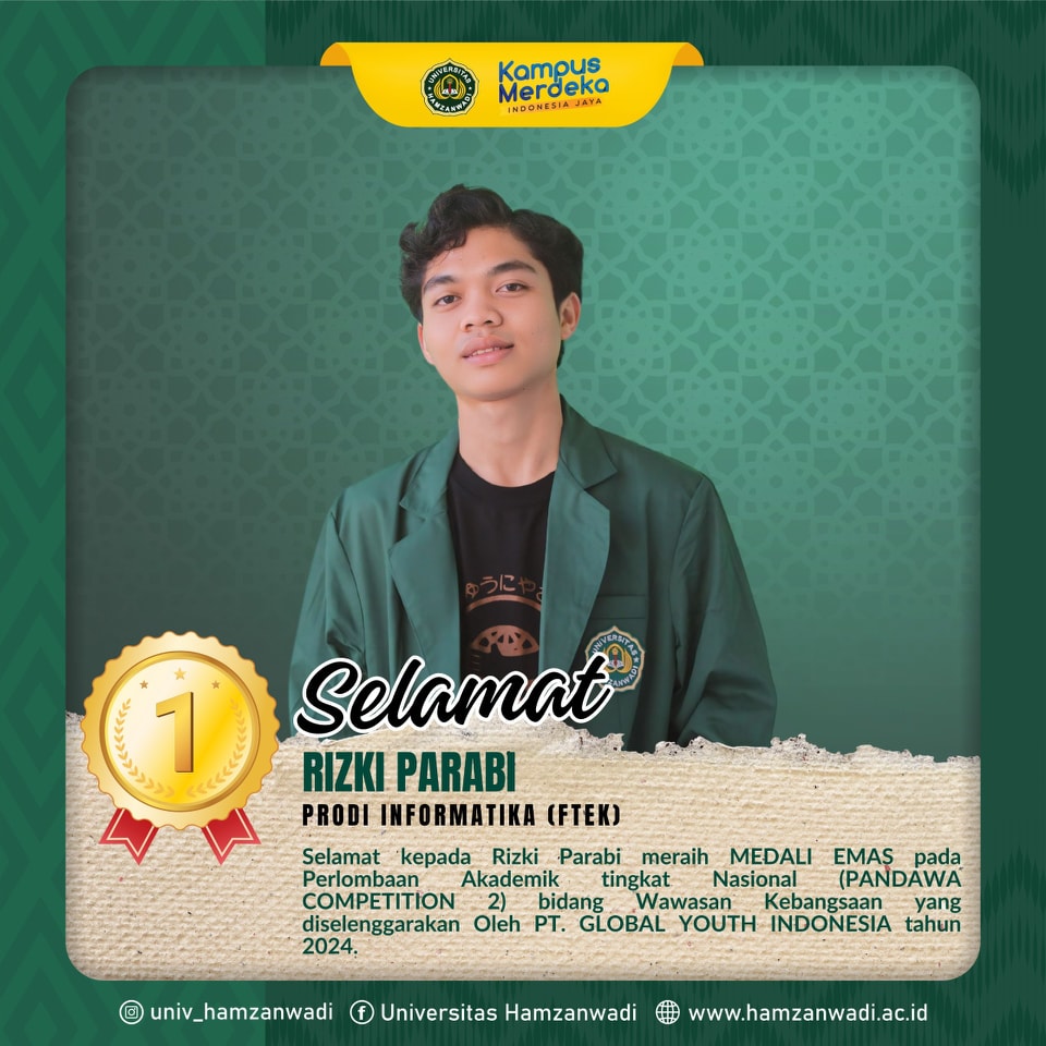 Universitas Hamzanwadi kembali menorehkan prestasi gemilang di tingkat nasional melalui salah satu mahasiswanya dari Fakultas Teknik. Rizki Parabi, mahasiswa Program Studi Informatika (FTek), berhasil meraih Medali Emas pada Perlombaan Akademik Tingkat Nasional Pandawa Competition 2.